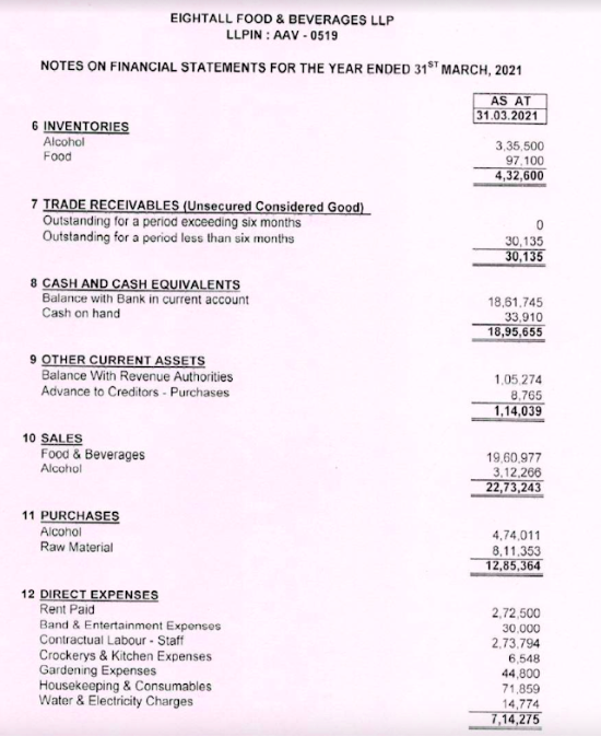 The P&L account further shows that as on March 31, 2021, the company had an inventory of alcohol worth Rs 3.35 lakh, food sales of Rs 19.6 lakh and liquor sales of 3.12 lakh.