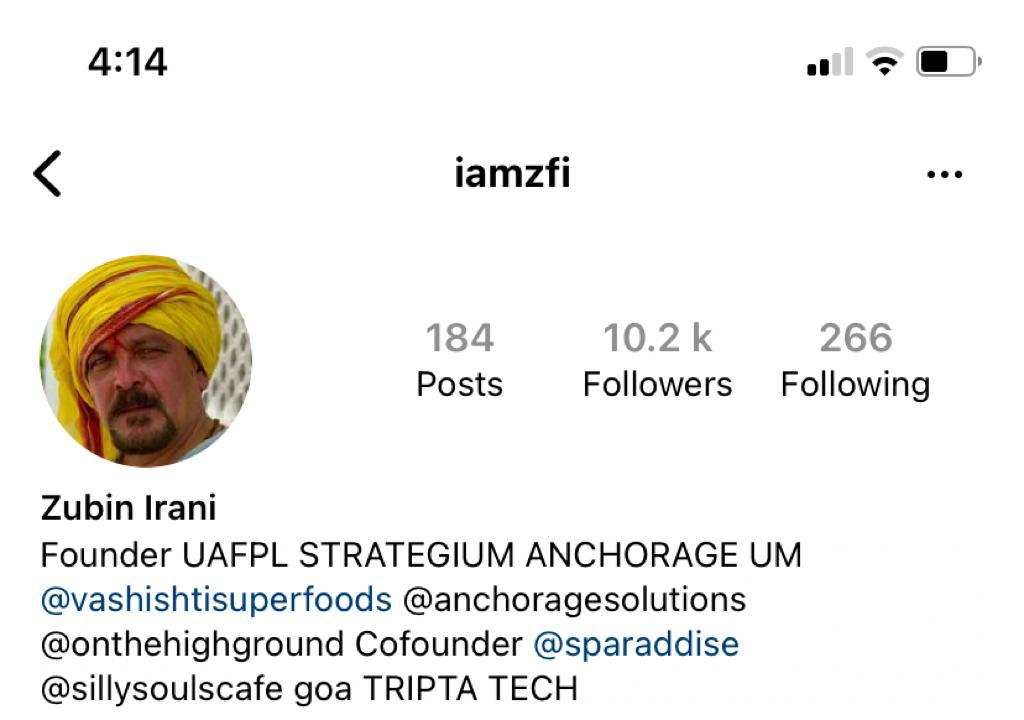 Image 1: Screenshot of Zubi Irani's profile on his Instagram account.