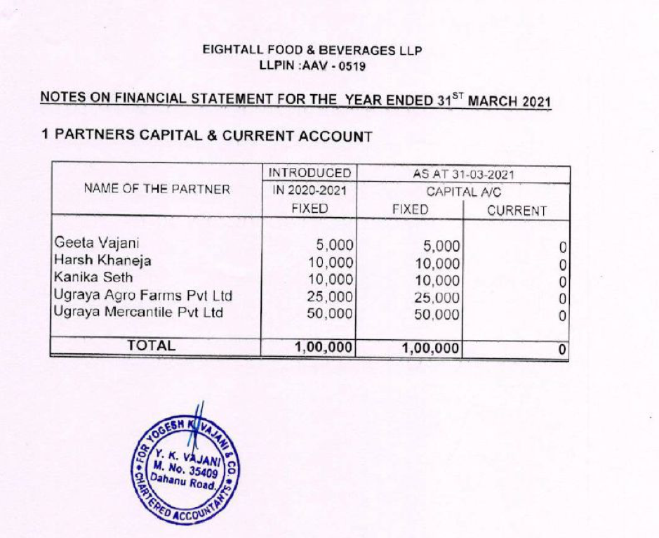 We checked the last available balance sheet of Eightall and confirmed what was mentioned in the two board resolutions. As of March 31, 2021, the two Ugraya companies hold 75% shares of the LLP. The then partners, Harsh Khaneja and Kanika Seth, held 10% each, and Geeta Yogesh Vajani owned the balance 5% shares (see Image 2 above).
