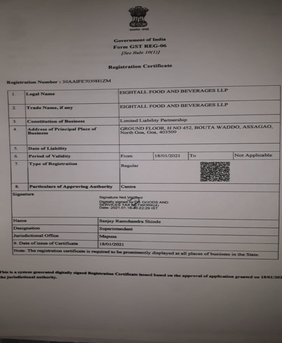 The restaurant aggregator source confirmed that Silly Souls Goa Cafe and Bar had listed its GST No. as 30AAIFE7039H1ZM – which is identical to that of Eightall Food and Beverage – and had placed a copy of the registration certificate with that number on file with the aggregator.
