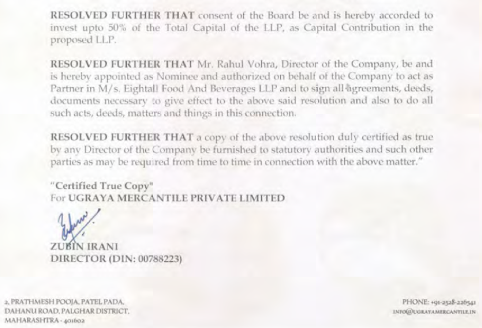 On November 5, 2020, Ugraya Mercantile Pvt Ltd and Ugraya Agro Farms Pvt Ltd passed board resolutions deciding to incorporate Eightall Food and Beverages LLP. It was resolved that Ugraya Mercantile will hold 50% shares of the LLP and nominated the name of Rahul Vohra as its DP nominee. The board resolution was signed by Zubin Irani.