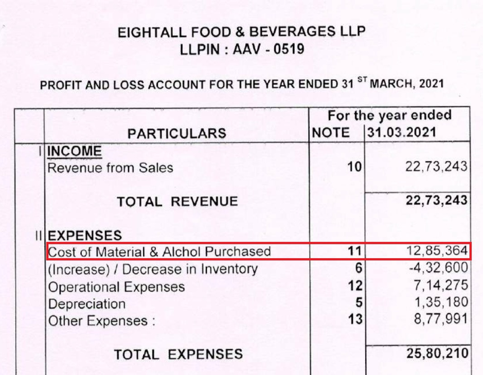 (3) balance sheets and profit/loss statements filed by the Irani family company for the financial year ending March 31, 2021 and obtained by The Wire show that the company spent money purchasing “material and alcohol” and food during the year, sold food and alcohol, and noted the value of its food and alcohol inventory – which strongly indicates that the business of Eightall Food and Beverage includes the sale of liquor, for which a license is required by law. One of the stated aims of the company is to "operate restaurants".