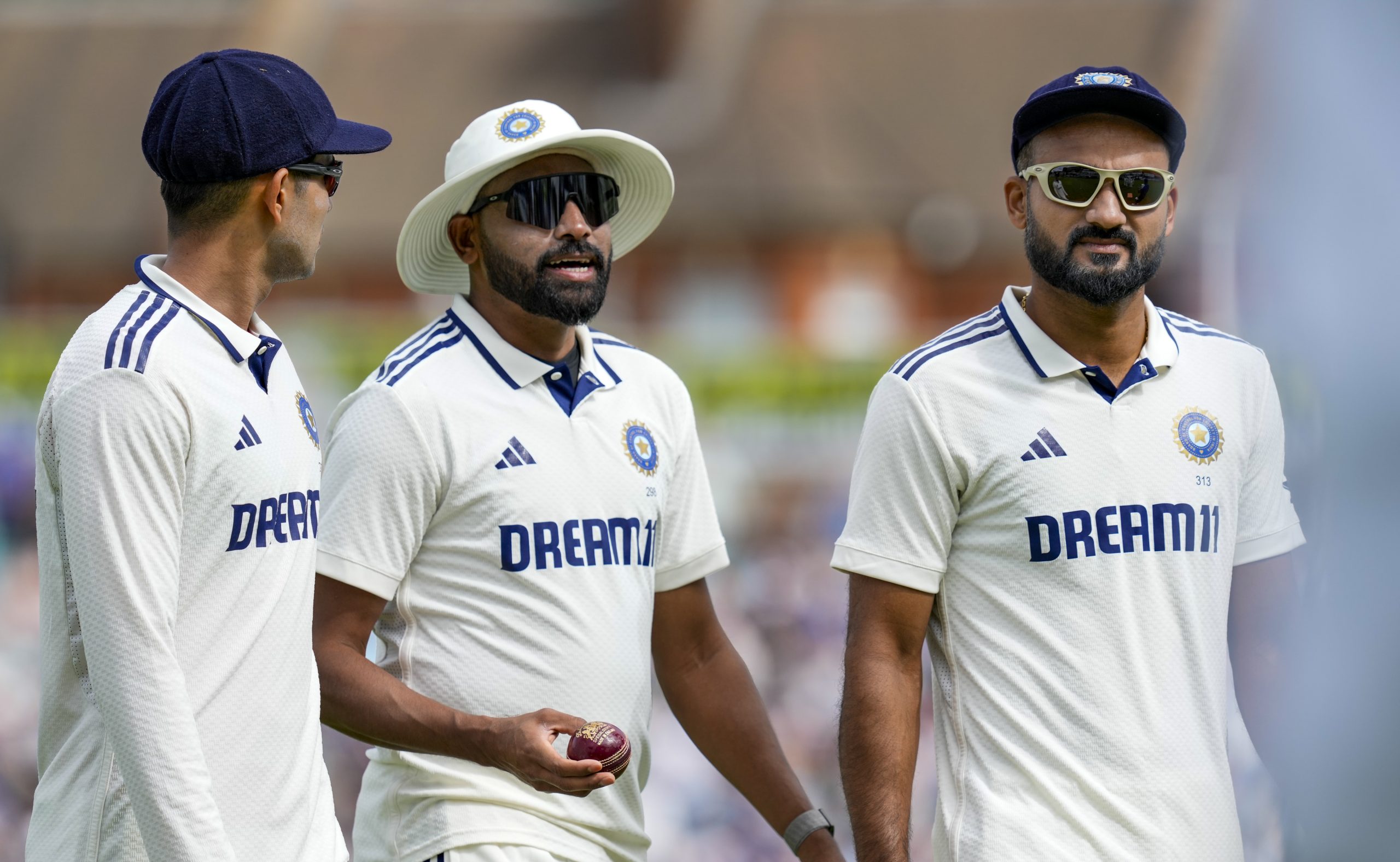 India's captain Shubman Gill with Mohammed Siraj and Prasidh Krishna during the fourth day of the fifth Test match between India and England, at The Oval cricket ground, in London, England, August 3, 2025. Their jerseys says 'Dream11' because of the company's title sponsorship of the Indian cricket team, which it withdrew on August 24, 2025. Photo: PTI/R. Senthilkumar