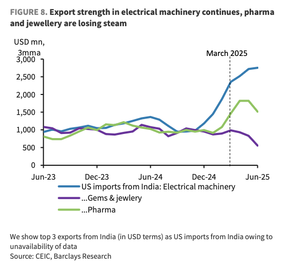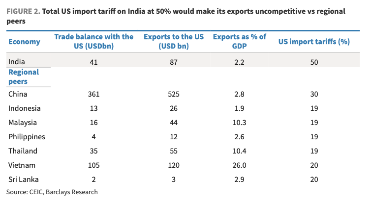 A note by Barclays carries the following figure, displaying the situation of India's competitiveness is the post-tariff markets: