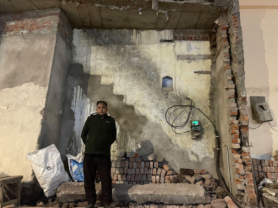 Rakesh Kumar Gupta stands outside the remains of his three-storey shop and residence, yet to be rebuilt even a year since it was demolished. Photo: Sabah Gurmat