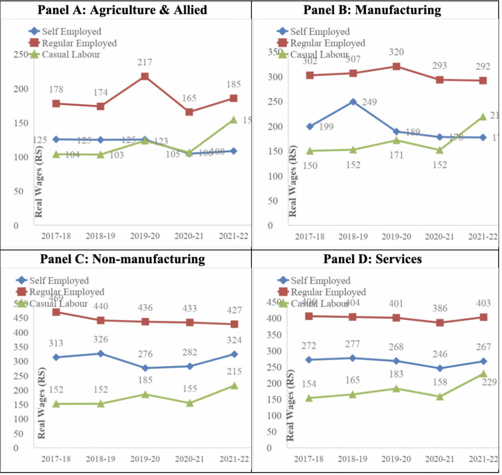 Graph: Real wages (in Rs at 2011 price) by the sector and type of employment, 2018-2022