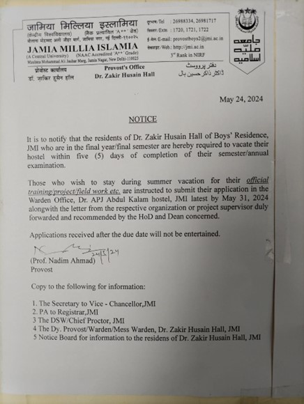 A notice issued by the Jamia administration in May, asking students to vacate their hostel. Photo: Special Arrangement