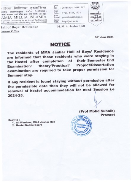 to submit their application in the Warden Office, Dr. APJ Abdul Kalam hostel, JMI latest by May 31, 2024 alongwith the letter of acceptance from the respective organization or project supervisor duly forwarded and recommended by the HoD and Dean concerned.”