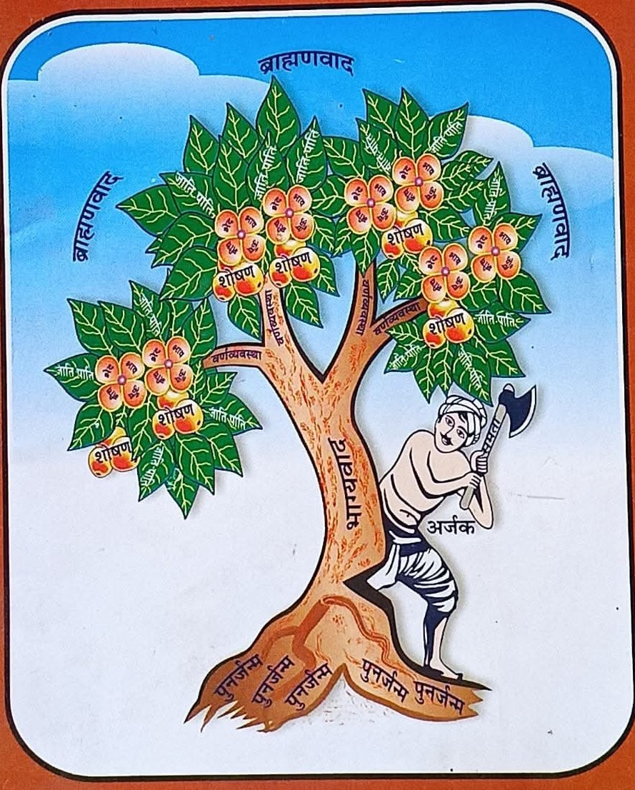 The first picture shows a farmer in a dhoti chopping down a tree (Brahmanvad). The tree’s roots are labelled as rebirth, its trunk as fatalism, its branches as the Varna system, its leaves as castes, its flowers as discrimination and its fruits as oppression. On the other end, a person is seen watering a different tree named Manavvad. The roots of this tree are materialism, trunk equality, branches democracy, leaves socialism, flowers happiness and fruits prosperity.