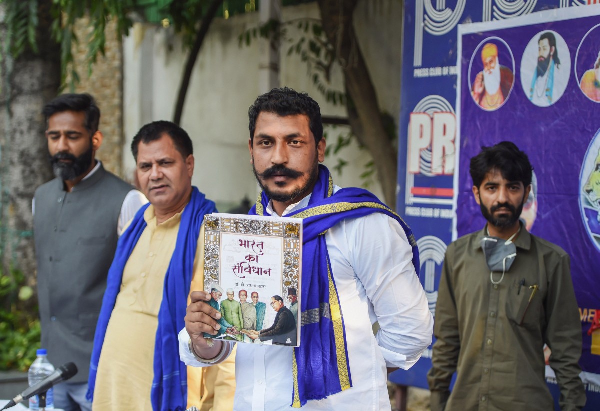 Bhim Army Chief and Azad Samaj Party Founder Chandrashekhar Azad addresses a press conference on Hathras case and other issues, in New Delhi, October 5, 2020. Photo: PTI