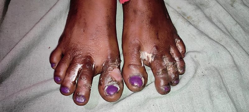 Lowering the shoulders of her kurta, Shakuntla pointed at her wounds. "They still hurt. It feels as if there are fires blazing beneath my skin. Throughout the winter, I could not wear slippers or socks. I could not use a blanket even on the chilliest of nights. My toe is gone," she said.