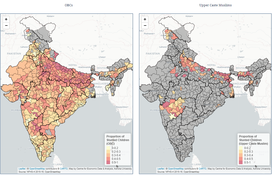 For the OBCs and upper-caste Muslims, in the BIMARU region, the prevalence of stunting in 61% and 71% of the districts, respectively, is greater than 40%.