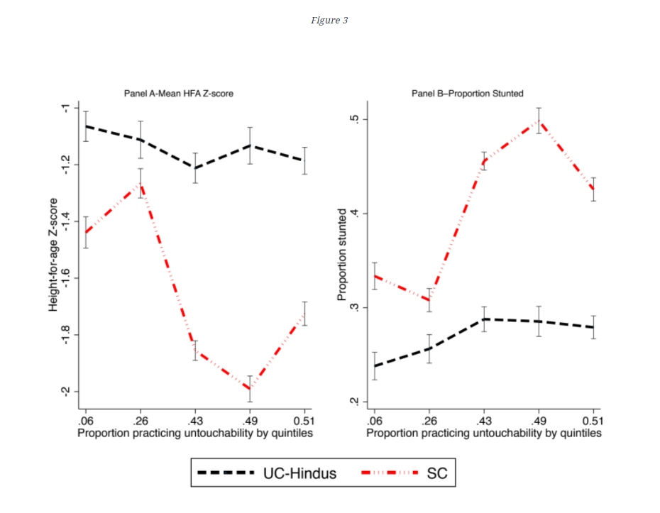 Figure 3 shows that Dalit children’s HFA Z-score sharply decreases in areas where the practice of untouchability is more prevalent. In contrast, there is a much weaker association between height/chronic malnutrition levels and the proportion of households reporting practicing untouchability, for upper-caste children.