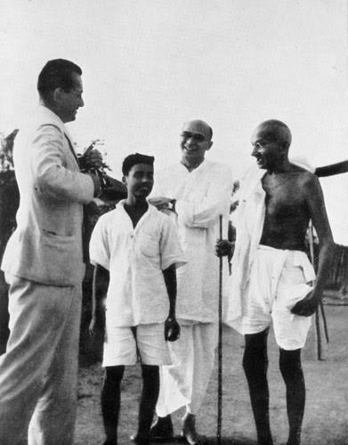 B. Louis Fischer with Gandhi at the Valmiki Mandir campus. Photo: By arrangement.
