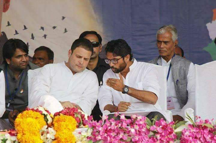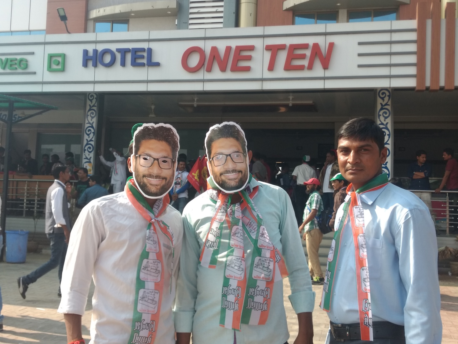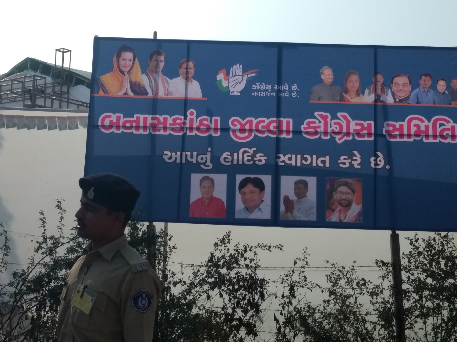Mevani’s team and local Congress workers and supporters have been promoting him as an independent candidate who has the support of Congress. On December 9, Mevani shared the stage with Rahul Gandhi in a public meeting at Kanodar. Posters of Banaskantha Zilla Congress Samiti put up on the day of the meeting had Mevani's photo along with local youth leaders of Congress below the photos of Sonia Gandhi, Rahul Gandhi and Ahmed Patel.