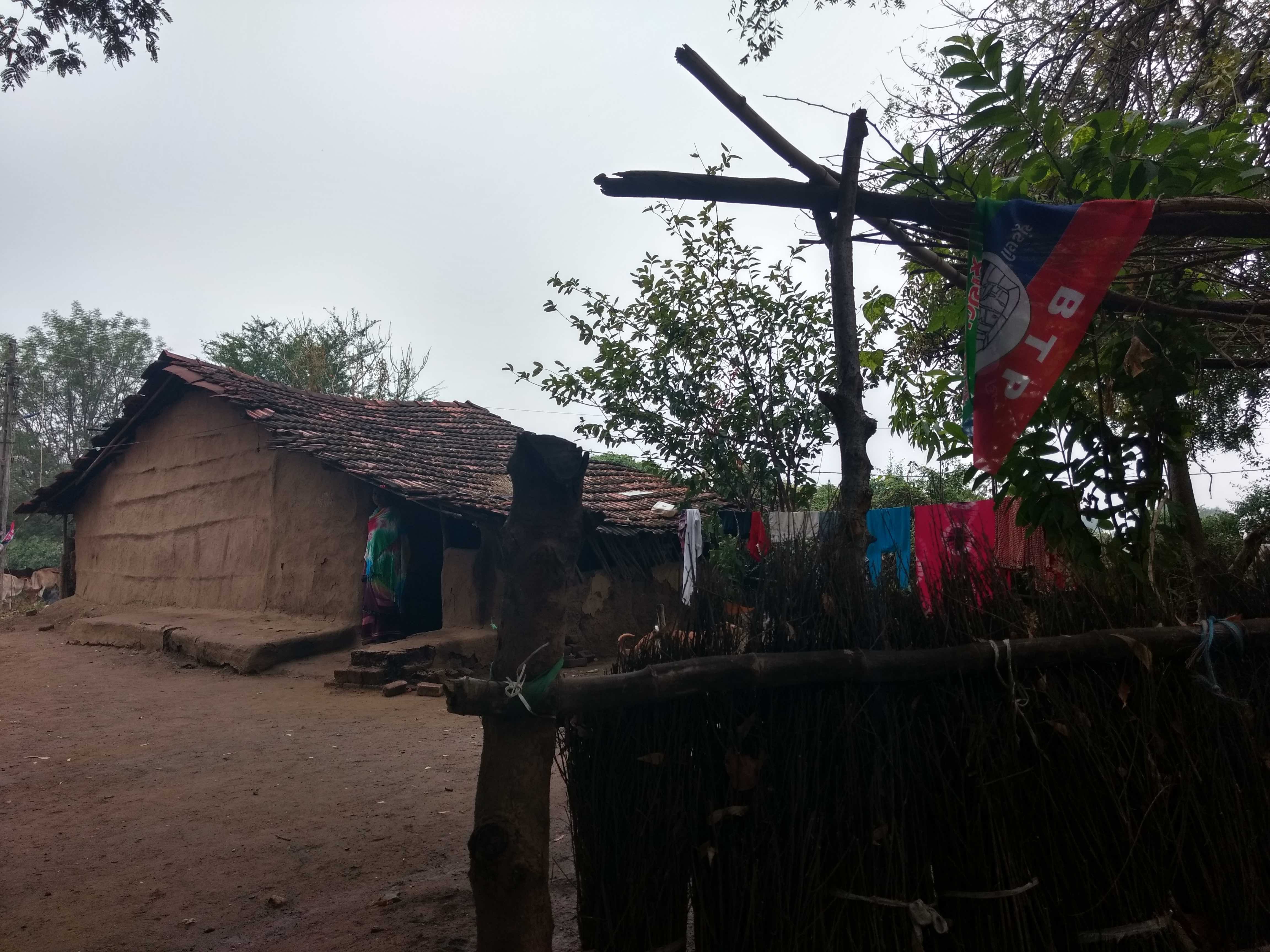 Flags of the Bhilistan Tiger Sena (BTS) can be seen on mud huts in the Jhagadiya constituency. Credit: Damayantee Dhar