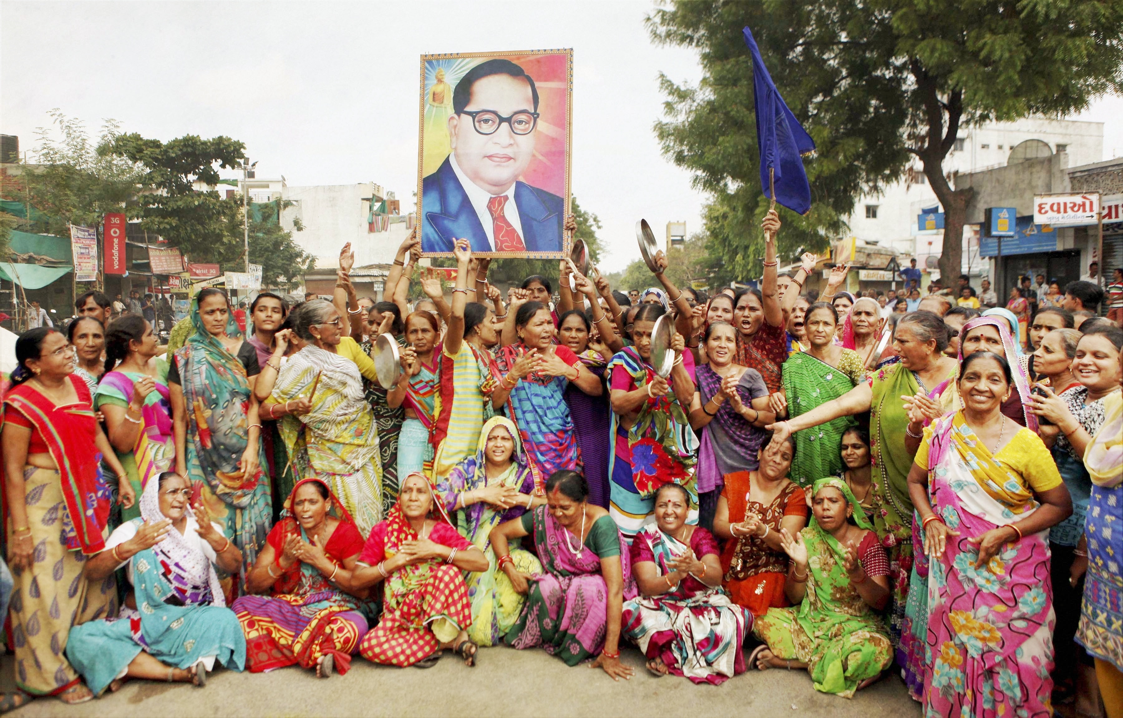 Women members of the Dalit community carry a portrait of B.R. Ambedkar as they block the traffic during a protest in Ahmedabad. Credit: PTI