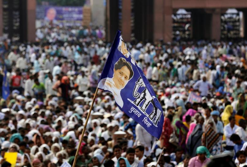 A Bahujan Samaj Party supporter waves a flag featuring the party's chief Mayawati during an election campaign rally in Lucknow. Credit: Reuters/Pawan Kumar