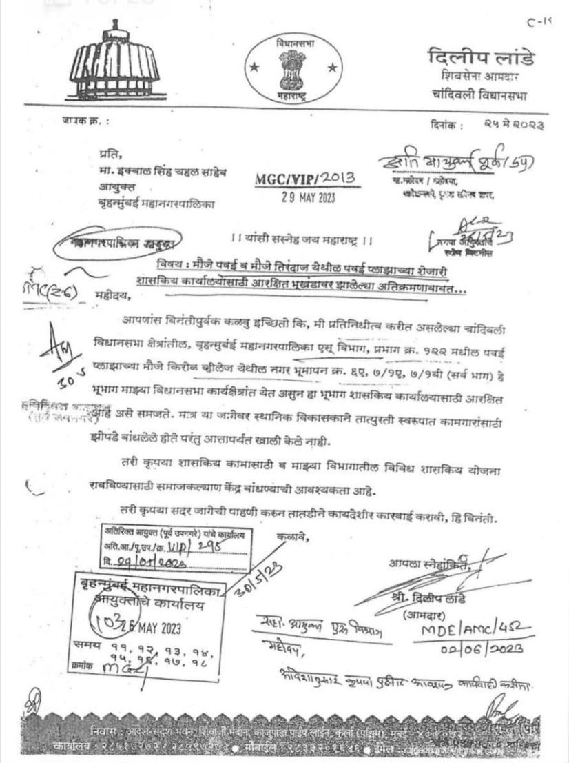 Shiv Sena leader and Member of Legislative Assembly, Maharashtra, Dilip 'Mama' Lande's letter to the Municipal Commissioner, dated May 29, 2023.