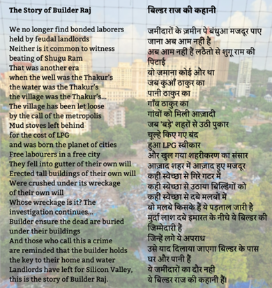 The poem 'Builder Raj ki Kahaani' by Sabki Library volunteer Arpit Rai attempts to capture the Builder Raj phenomenon.