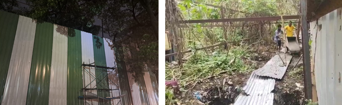 Life in Jai Bhim Nagar, Powai, Mumbai, after the demolition (R) and during the construction of a new site of 'luxurious living' (L). Photo: Tejaswin Anoopkumar
