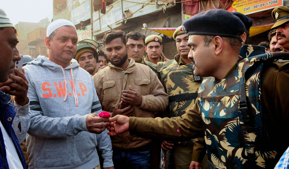 A Muslim man offers a member of security forces personnel a flower as part of anti-CAA protests on December 20. Photo: PTI