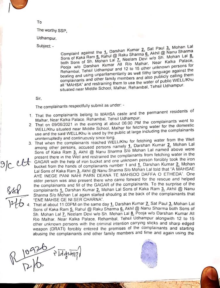The complaint forwarded to SSP Udhampur by Mahasha community men. Photo: Bivek Mathur