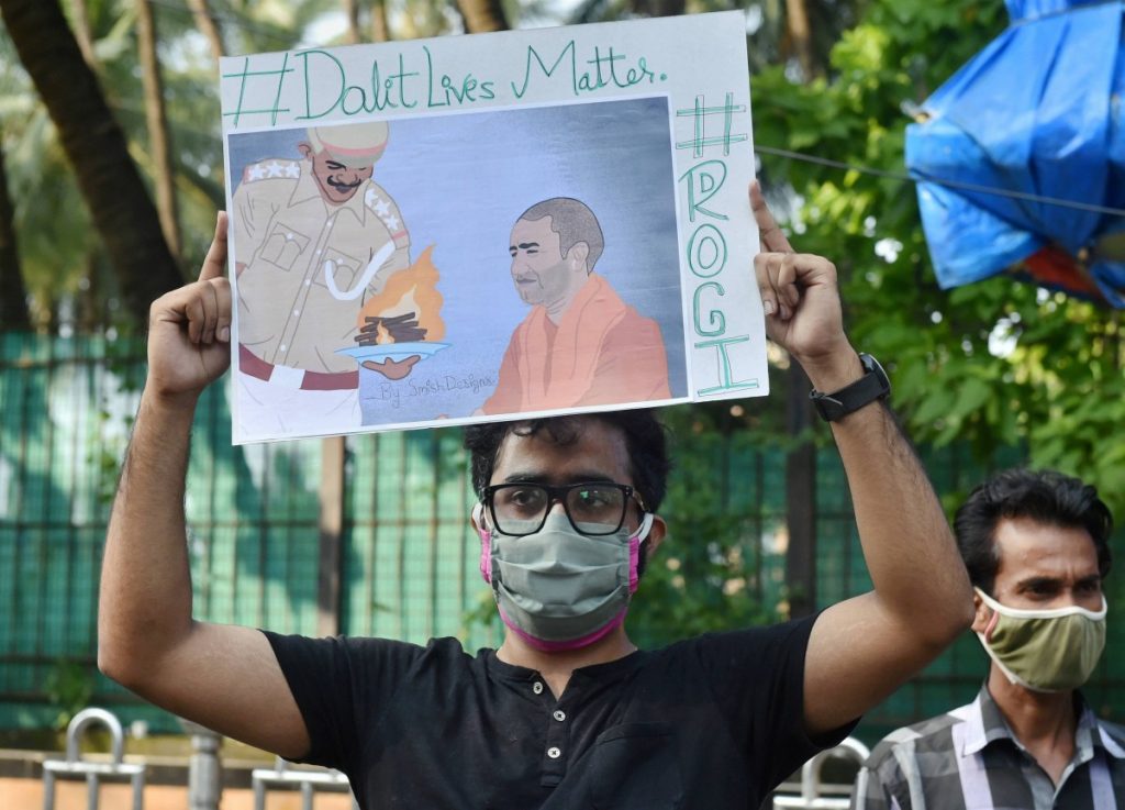 A man holds up a Dalit Lives Matter placard at a protest against the Hathras brutality. Photo: PTI