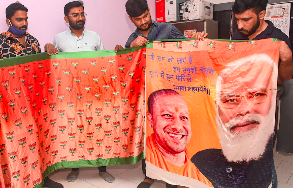 Workers show saree printed with BJP slogans and portrait of Prime Minister Narendra Modi and UP CM Yogi Adityanath, in Surat, Tuesday, Jan. 18, 2022. Photo: PTI
