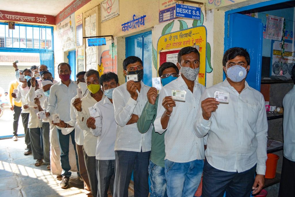 Voters show their identity cards as they wait for their turn to cast their votes for gram panchayat election, at Varunji village in Karad, January 15, 2021. Photo: PTI