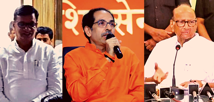 Congress's Balasaheb Thorat, Shiv Sena's Uddhav Thackeray and NCP's Sharad Pawar. Photos: Twitter