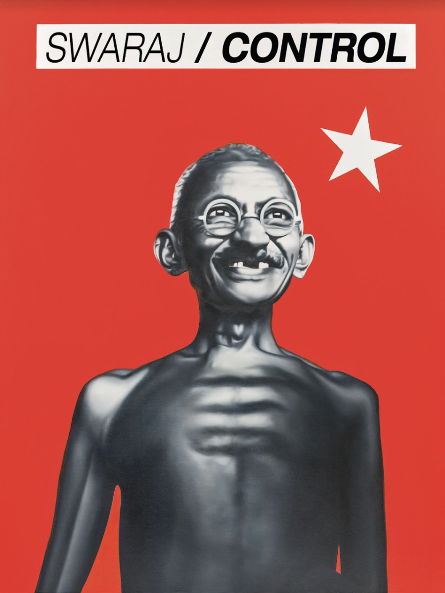 Riyas Komu, “Swaraj/Control,” from On International Workers’ Day, Gandhi From Kochi (2015), oil on canvas, 72 × 54 inches, private collection. Image courtesy of the artist.