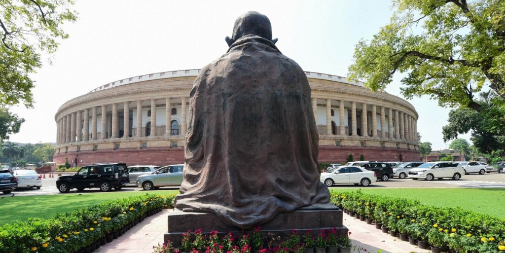 Statue of Mahatma Gandhi on the premises of the Parliament House during the monsoon session, New Delhi. September 20, 2020. Photo: PTI/Kamal Kishore