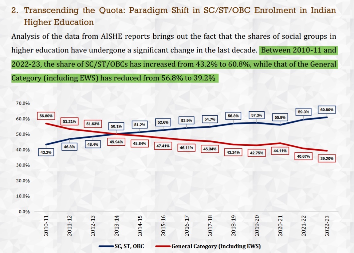 Even at 60.8% collective enrolment, SC, ST and OBC students lag behind their 76% population share. Their "dominance" is illusory, born of a deliberate omission of proportional comparisons.