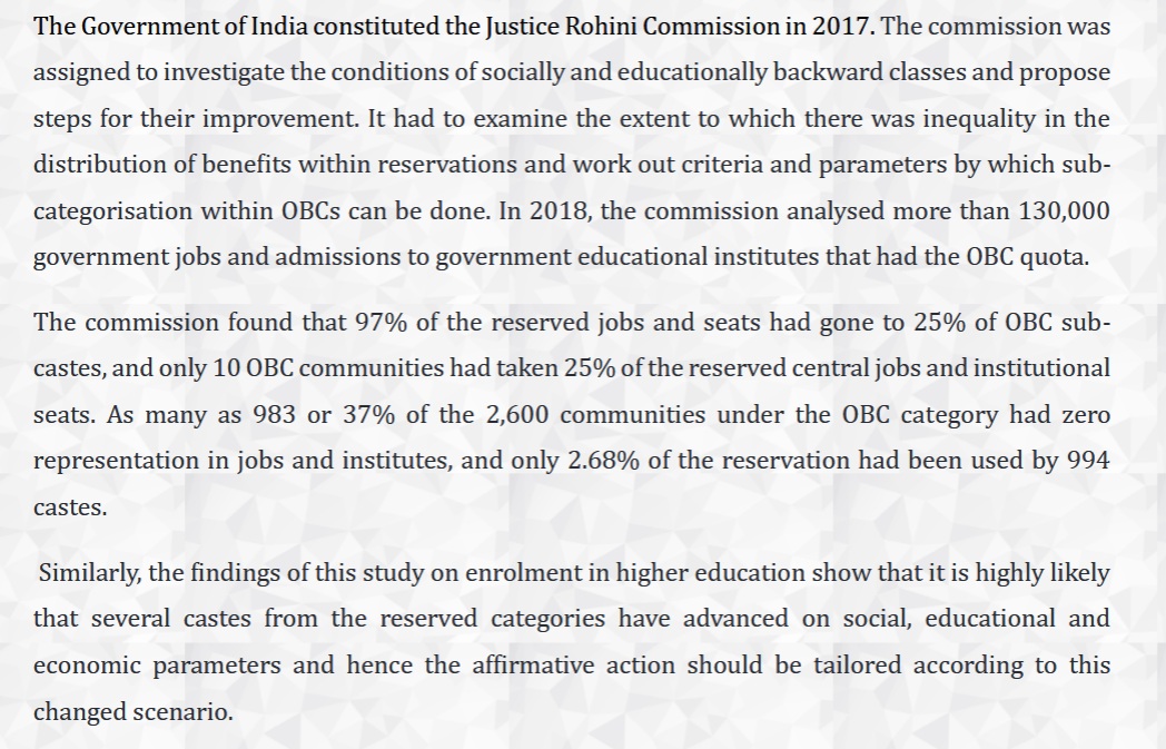 The IIM Udaipur study refers to the Justice Rohini Commission on sub-categorising the OBC quota, but goes a step further, suggesting exclusion of caste groups that have fared well from reservation benefits. Source: Screenshot of IIM study