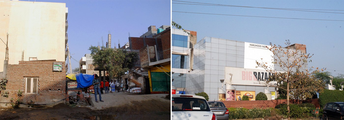 Putul Daloi lives in Bengali Mohalla (left) in New Delhi , not far from the mall where her husband worked. Credit: Bhasha Singh/PARI