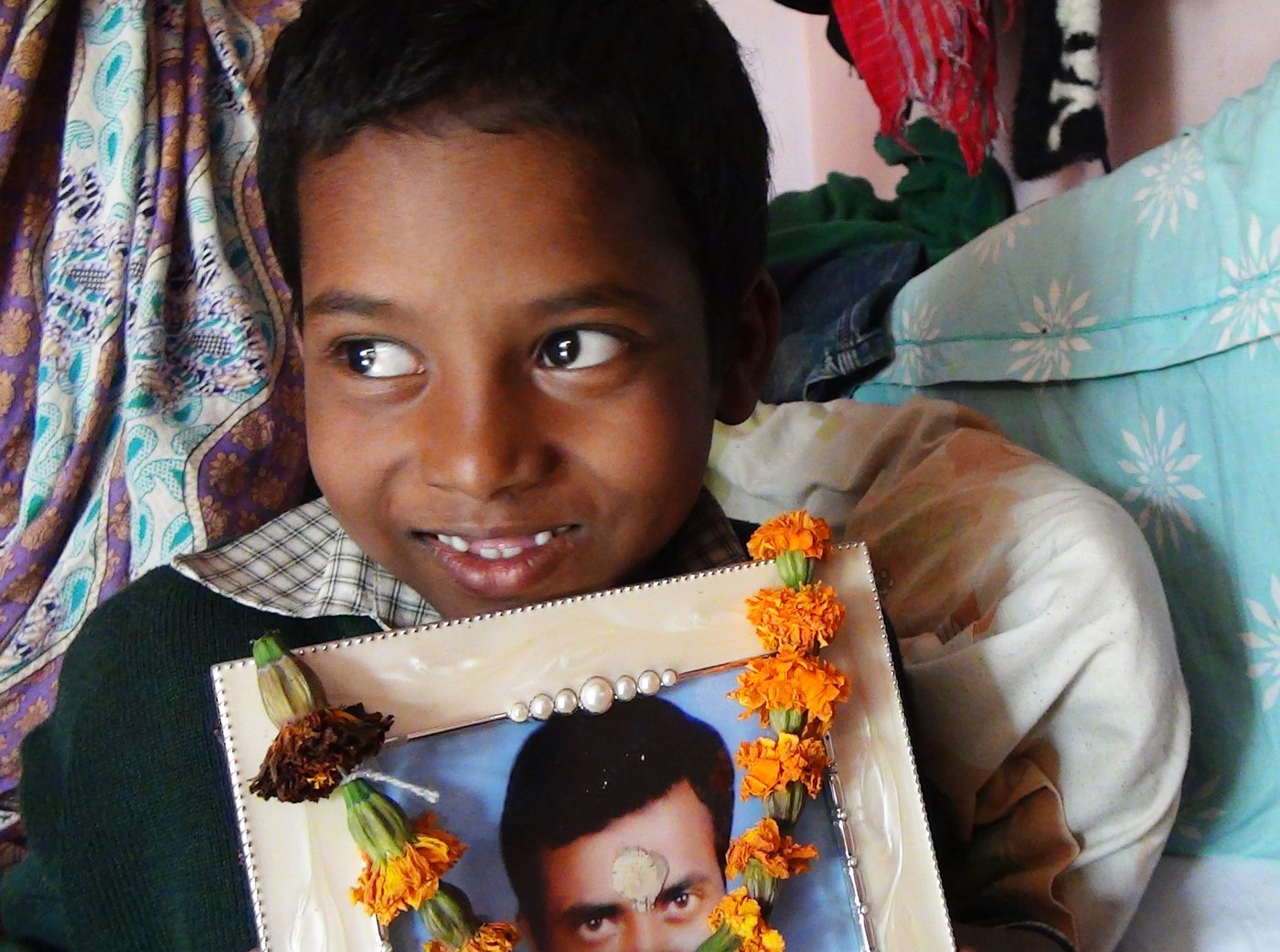 Their son, Amit, 9, with his father's photograph: 'I will become an engineer and develop technology that will prevent humans cleaning gutters'. Credit: Bhasha Singh/PARI