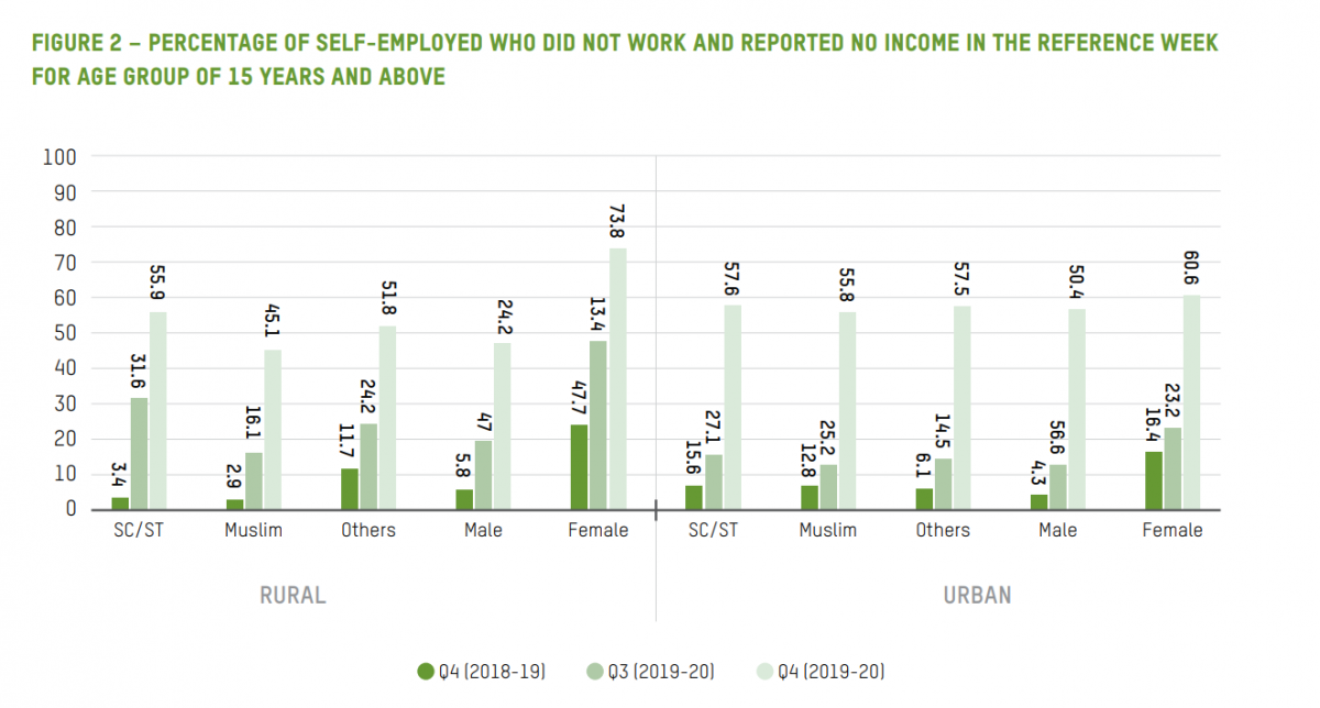 In urban areas, however, the wages of both men and women saw a steep decline in the FPQ. Self-employed men saw earnings decline by 36% from PPQ to FPQ while the same figure for women was 26%.