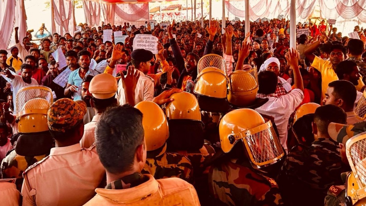 Despite heavy repression and the threat of arrests, hundreds of people from villages across Tijmali gathered at the public hearing venue at Sunger chanting slogans like ‘Vedanta-Mythri Company, go back’. Placards reading ‘Tijmali is ours, not anyone’s private property to be mined’ filled the venue. Amidst heavy deployment of police and eight platoons of paramilitary personnel, nearly 2,000 people unitedly showed their dissent at the public hearing.