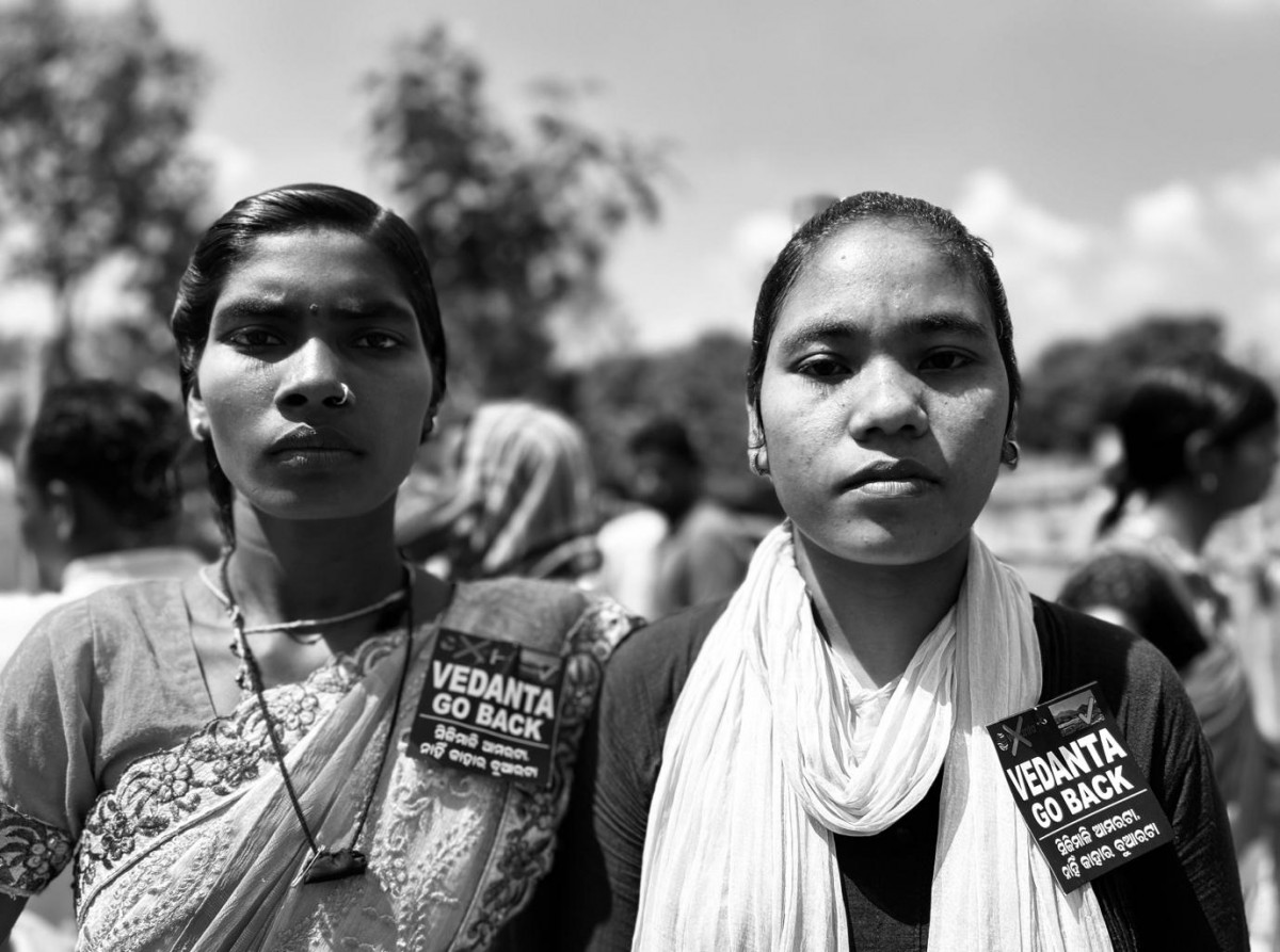 Bharati Nayak (25), a Dalit youth leader (left) and Namita Majhi (24), an Adivasi youth leader (right) from Kantamal proudly wore badges that read ‘Vedanta Go Back’. Bharati and Namita were among the 20-odd speakers at the public hearing on October 16.