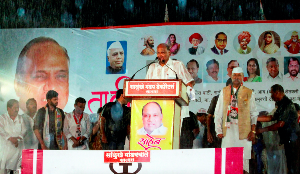 Nationalist Congress Party (NCP) president Sharad Pawar addresses a public meeting in the rain ahead of the Assembly elections, in Satara district of Maharashtra on October 18. Photo: PTI