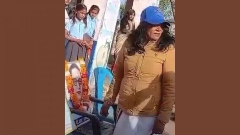 In the video from January 26 this year, Bairwa can be seen standing in front of garlanded photos of Mahatma Gandhi, Savitribai Phule and B.R. Ambedkar while a group of men are confronting her.
