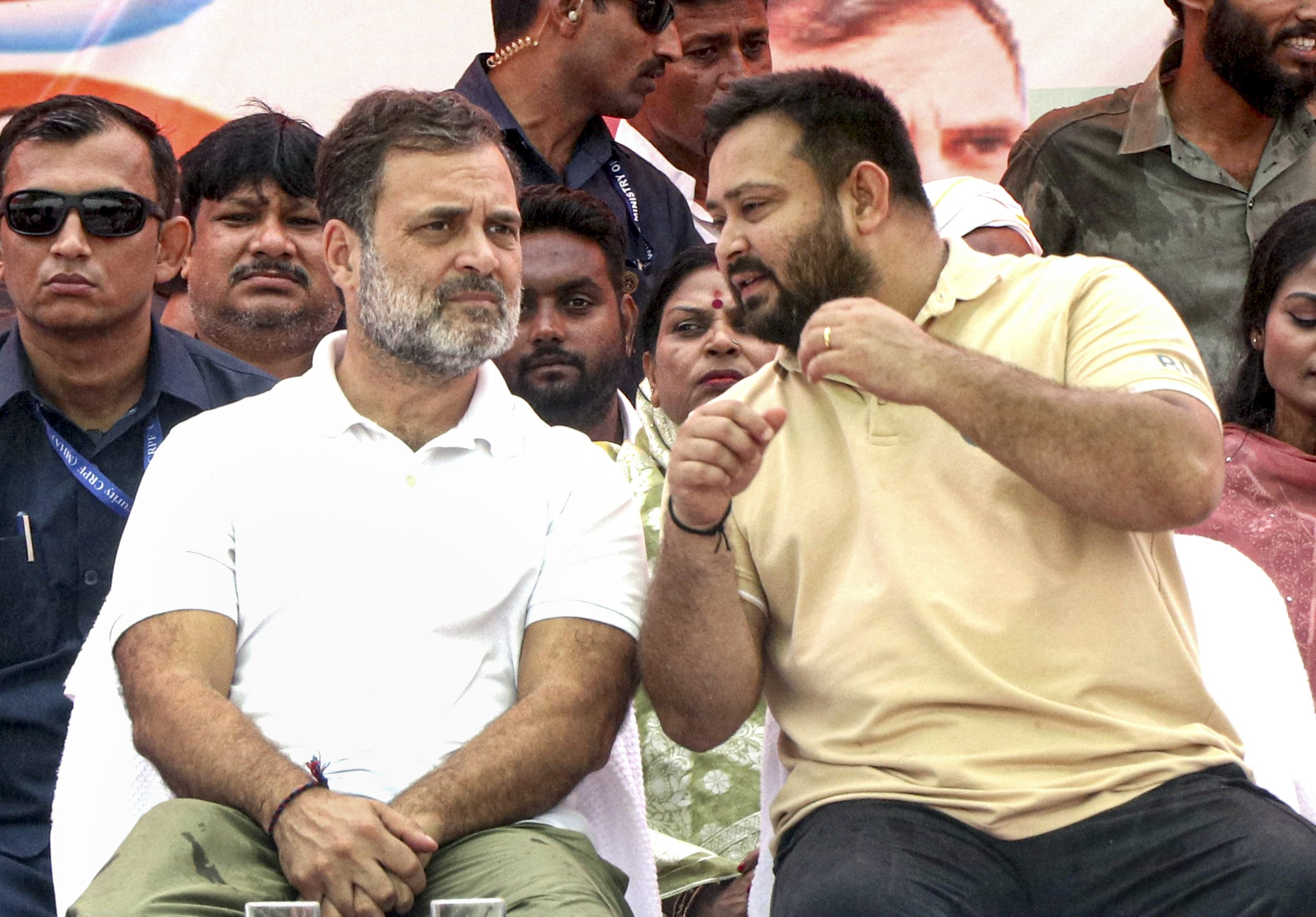 LoP in the Lok Sabha and Congress leader Rahul Gandhi with RJD leader Tejashwi Yadav during a public meeting ahead of the Bihar Assembly elections, in Muzaffarpur, Bihar, Wednesday, Oct. 29, 2025. Photo: PTI