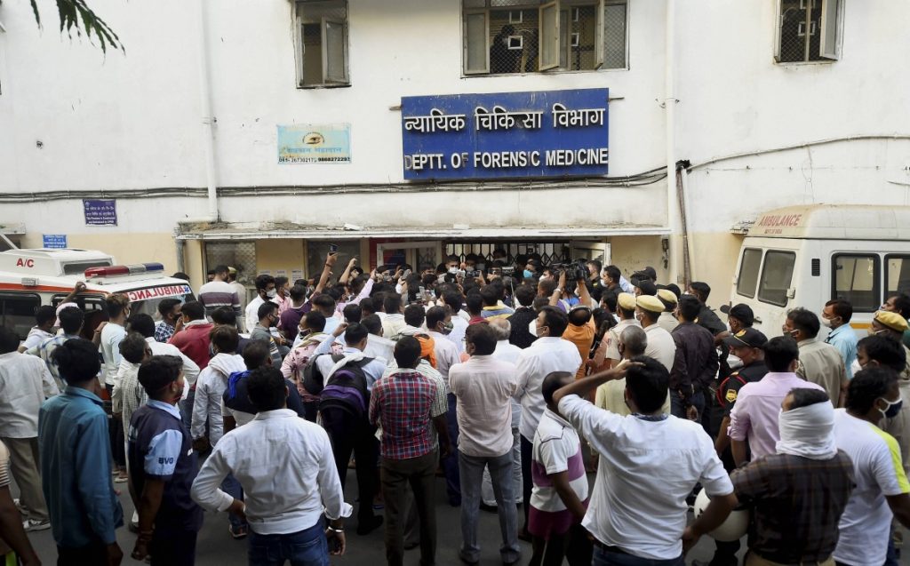 Bhim Army and Congress Party workers stage a protest outside Safdarjung Hospital over the death of Hathras gangrape victim, in New Delhi, Tuesday, Sept. 29, 2020. Photo: PTI