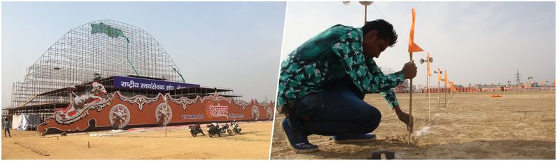 Gupta and Mittal are distracted as they are called towards the under-construction stage, about a kilometre away. “Come, let us lift up the horse,” Gupta says to me. The horse Gupta referred to is part of a massive cut-out depicting a scene from the epic Mahabharata where Krishna is seen offering advice to Arjuna. The cut-out will form the base of the stage which, according to RSS functionaries, will be 200 feet in length, 100 feet in width, and 35 feet high.