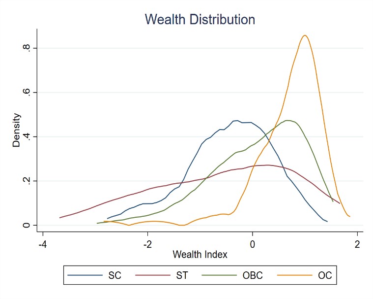 SC, ST and OBC, in general, are less wealthy relatively, as indicated by their curves being left to the Open category curve. Their distributions are also more spread out, indicating that within their caste, if a lot of individuals are wealthy a lot are poor too.