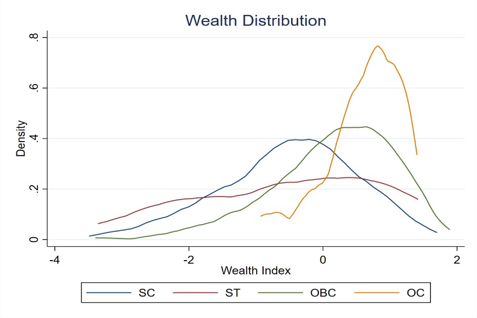 Referring to the graph below to elaborate this further, it becomes evident that the probability of having a wealth index less than 0 is significantly higher for individuals who belong to SC, ST or even OBC, as compared to those in the OC category. Much of the upper tail of the wealth distribution is accounted for by the OC category. On another hand, the lower tail of the wealth distribution is mostly accounted for by the ST category.