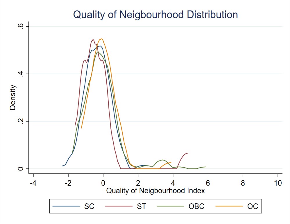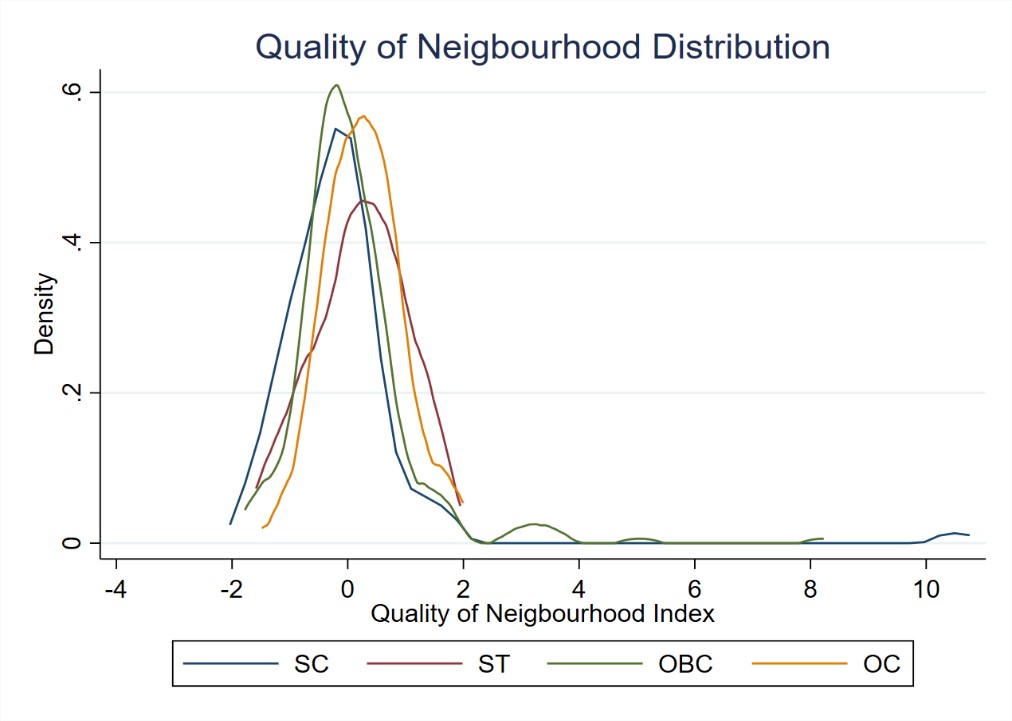Here quality of the neighbourhood measures factors like opportunities for education, opportunities of work, access to health services, quality of housing, and sanitation facilities in the neighbourhood. The graphs below show caste-wise kernel density plots for the quality of a neighbourhood.