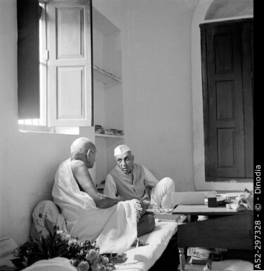 Gandhi talking with Jawaharlal Nehru on his 77th birthday. New Delhi. India. October 2, 1946. © Dinodia Photos