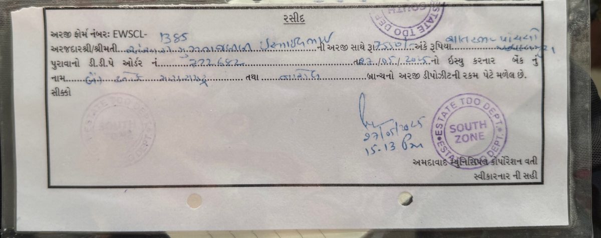 A deposit slip for submitting an EWS housing application paid by a former Chandola resident. Photo: Tarushi Aswani